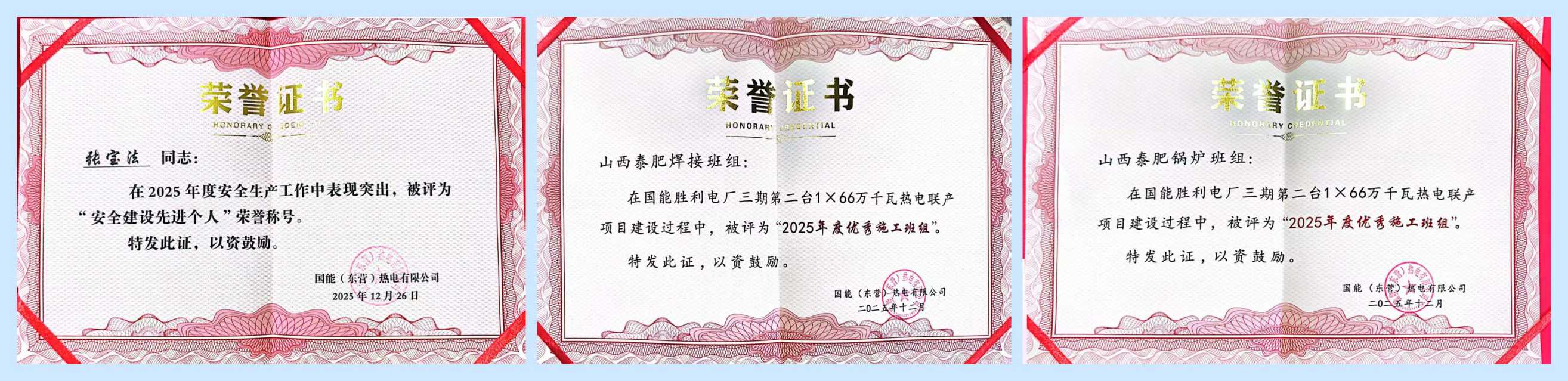 2025年12月31日,在這辭舊迎新的特殊日子里,國能(東營)熱電有限公司2025年度施工、安全先 進(jìn)榮譽(yù)表彰儀式順利舉行,從表彰現(xiàn)場傳來喜訊,山西泰肥建設(shè)集團(tuán)有限公司(以下簡稱“山西泰肥建設(shè)集團(tuán)”)參建的國能勝利電廠三期第二臺(tái)1×66萬千瓦熱電聯(lián)產(chǎn)項(xiàng)目中,旗下焊接班組、鍋爐班組憑借卓越的施工質(zhì)量、高 效的協(xié)作能力及優(yōu)異的項(xiàng)目履約表現(xiàn),雙雙被評為“2025年度優(yōu)秀施工班組”;集團(tuán)員工張寶法同志因在項(xiàng)目建設(shè)全過程中嚴(yán)守安全底線、踐行安全準(zhǔn)則,扎實(shí)推進(jìn)各項(xiàng)安全管理工作,被授予“安全建設(shè)先 進(jìn)個(gè)人”榮譽(yù)稱號、